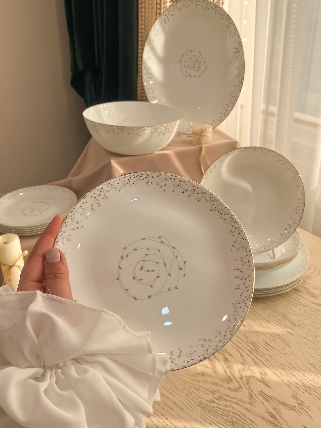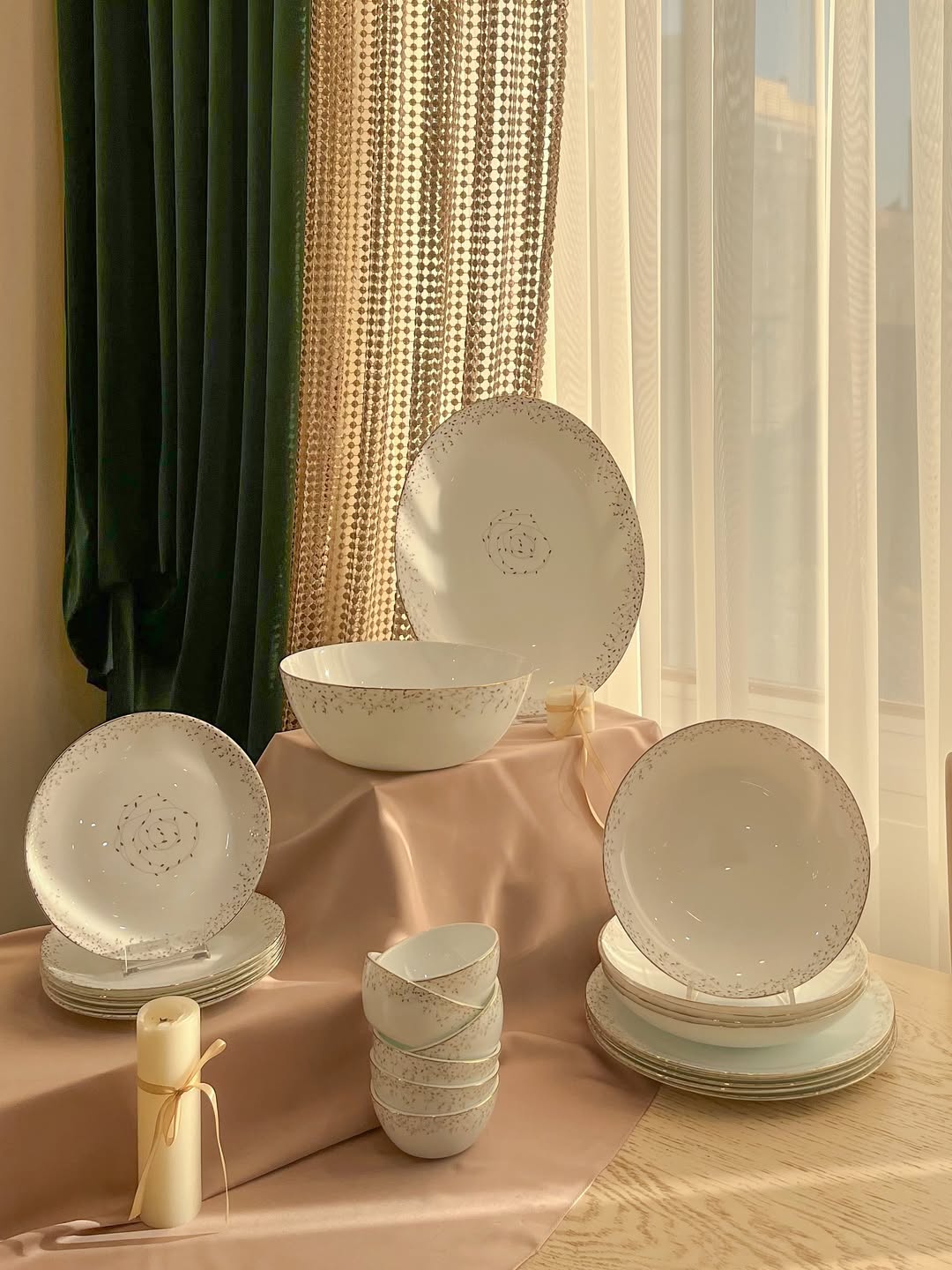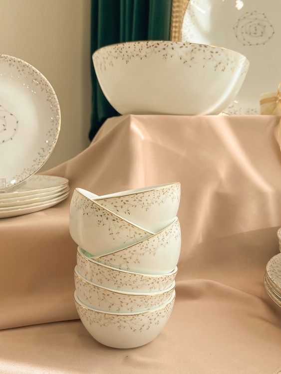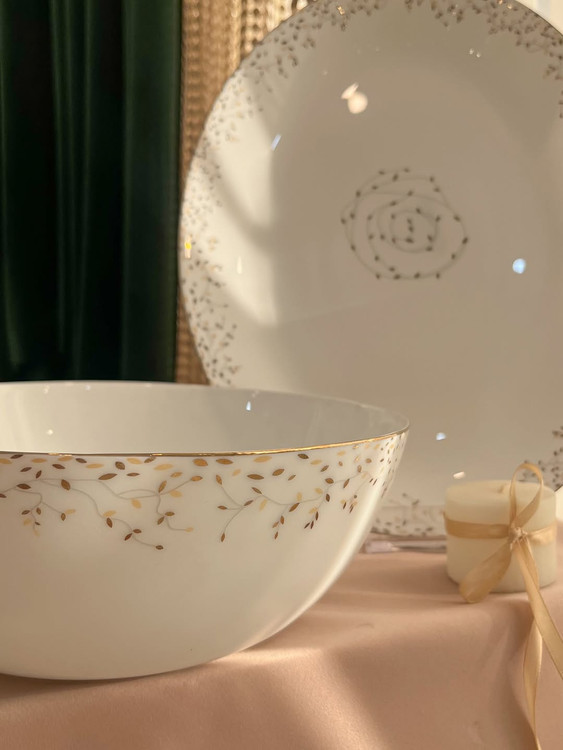 ارکوپال اسپرینگ همیشه پرطرفدار بوده و با طراحی لوکسش به یک انتخاب بی نقص تبدیل شده است.به علت طلای کار شده در ظرف, داخل ماکروویو نمیتوان استفاده کرد. این سرویس زیبا تولید گروه کارخانجات مقصود می باشد.اقلام سرویس :